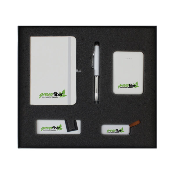 Included: White A6 size Notebook, White Metal Pen with Stylus and LED Light, 5000 mAh Mini Powerbank, White Mobile Phone Stand, White Slide Button USB Flash Drive 8GB.