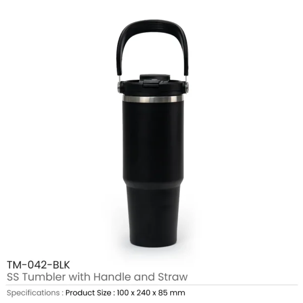 Tumbler in stainless steel double-wall vacuum insulated tumbler with flip-straw Lid and carry handle. The customized vacuum-insulated tumbler is ideal for keeping your beverage hot for hours. These tumblers are durable as they are made with premium quality stainless steel material. They also feature a double-wall design to maintain the freshness and taste of your drink.